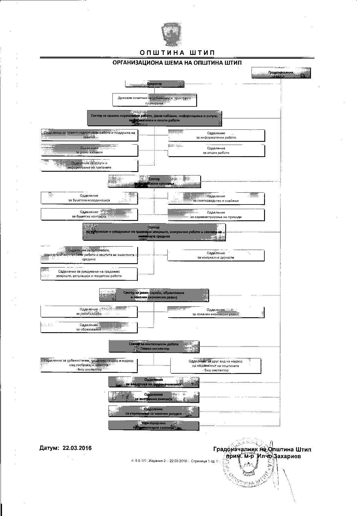 According to the Act for organizing, scope of action and way of task accomplishing of the municipal administration (refined text) published in the “Official Gazette of Shtip Municipality” No. 12/15, the municipal administration of the Municipality of Shtip is organized in the following sectors and departments:
